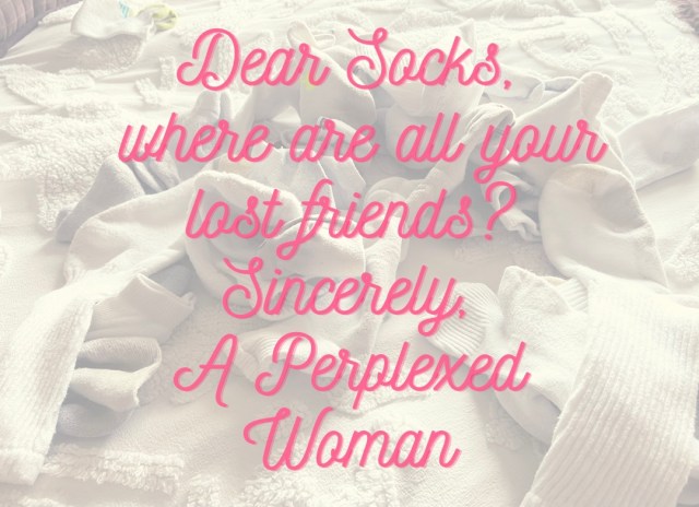 Every sock has a match. Except for the ones that get lost. Except for the ones I’m certain were in the pile when I put them in the washer and didn’t come out when I took them out of the dryer. Where the heck did those socks go? How did they get lost? How can a sock run away? Honestly. I have enough trouble keeping track of my schedule, what groceries we need, my hard working husband, my busy kids, and my dog who also steals socks, but not those socks.