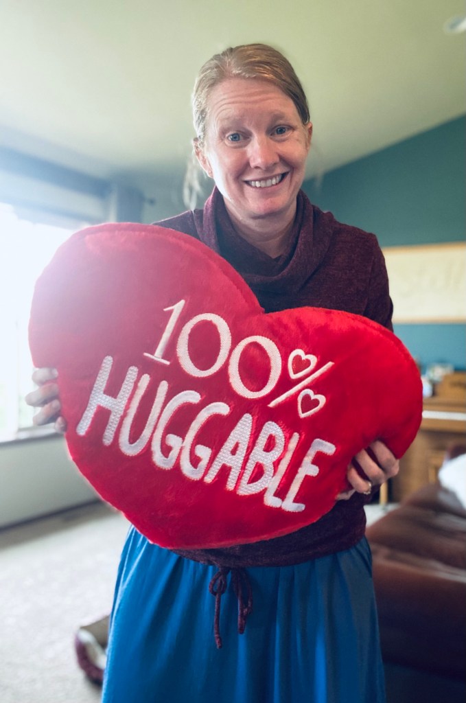Thirty-years later, my mom says yes to every such request from her granddaughter, which is how I ended up with a giant, red, heart pillow with the words “100% Huggable” from a garage sale last week. Where, I ask you, does one put a giant, red, heart pillow with the words “100% Huggable” in one’s home? Oy vey.